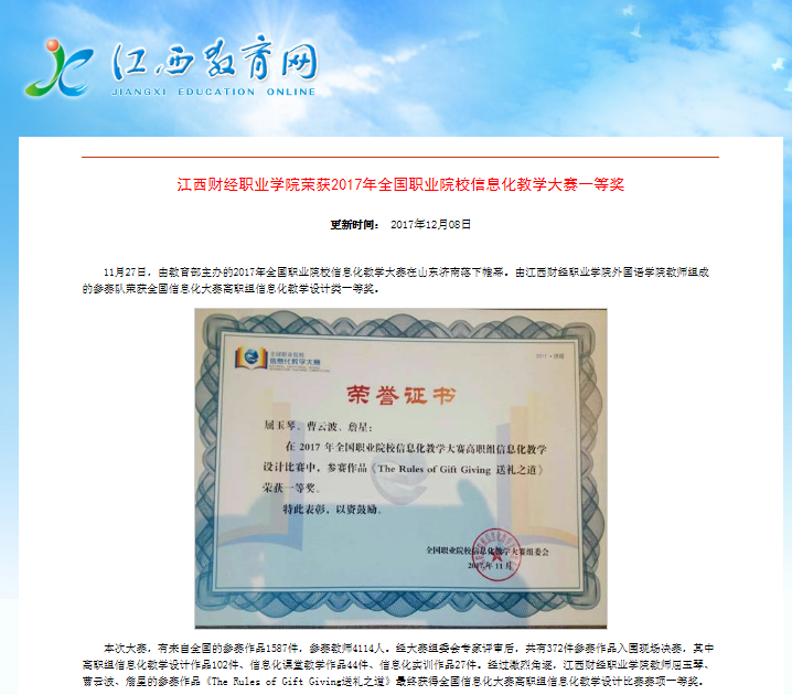 12月8日,江西教育网报道我校荣获2017年全国职业院校信息化教学大赛一等奖。