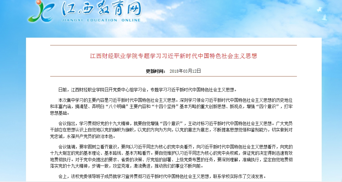 3月12日,江西教育网报道我校专题学习贯彻习近平新时代中国特色社会主义思想活动。