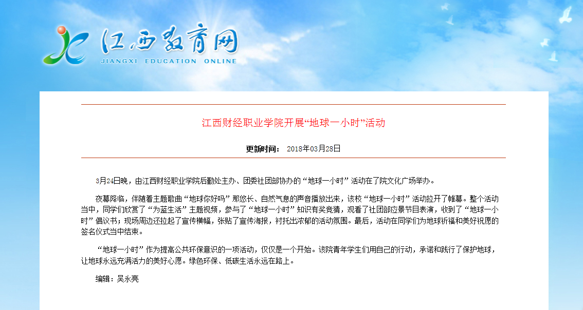 3月28日,江西教育网报道我校开展“地球一小时”活动。