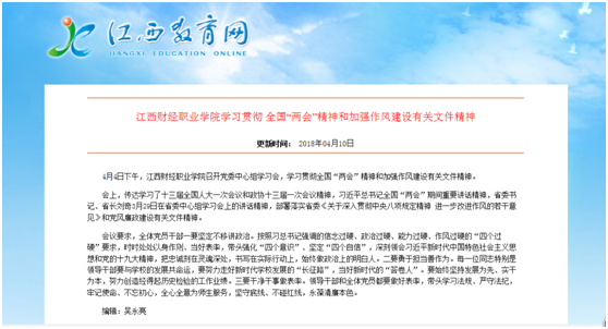 4月10日,江西教育网报道了我校学习贯彻 全国“两会”精神和加强作风建设有关文件精神。