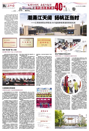 8月1日,江西日报在B2版“筑梦新时代 奋进新征程——致敬中国改革开放40周年”专题中以《潮涌江天阔 扬帆正当时——江西财经职业学院全力打造国家优质高职院校纪实》报道我院以国家优质院校建设为契机,深化教育教学改革取得显著成绩。