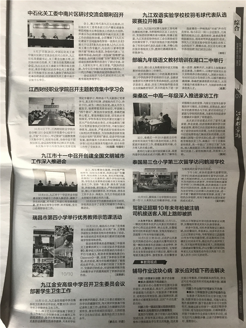 10月12日,《江南都市报》报道我校召开主题教育集中学习会一事。