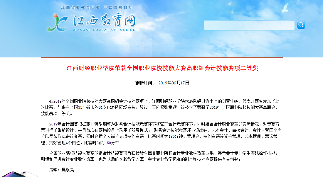 6月17日,江西教育网报道我校荣获全国职业院校技能大赛高职组会计技能赛项二等奖一事。