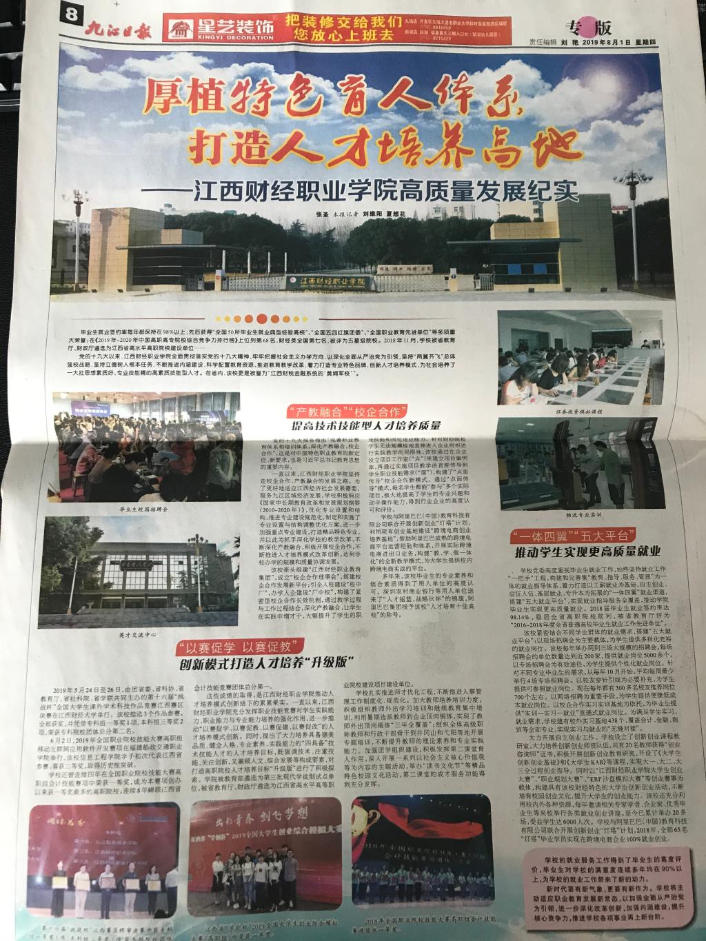 8月1日,《九江日报》整版报道我校创新人才培养模式,打造专业特色品牌先进经验。