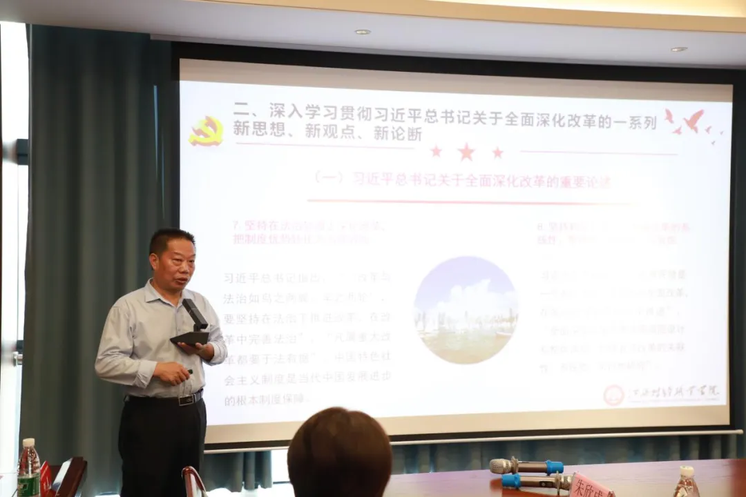 17日上午,我校马克思主义学院院长朱欣成教授为与会人员进行了《深入学习贯彻党的二十届三中全会精神》专题授课,从全会的主题、习近平总书记关于全面深化改革的一系列新思想新观点新论断及进一步全面深化改革的总体思路与系统部署三个方面深入浅出地解读了会议精神,并针对团员青年落实党的二十届三中全会精神提出了具体建议。