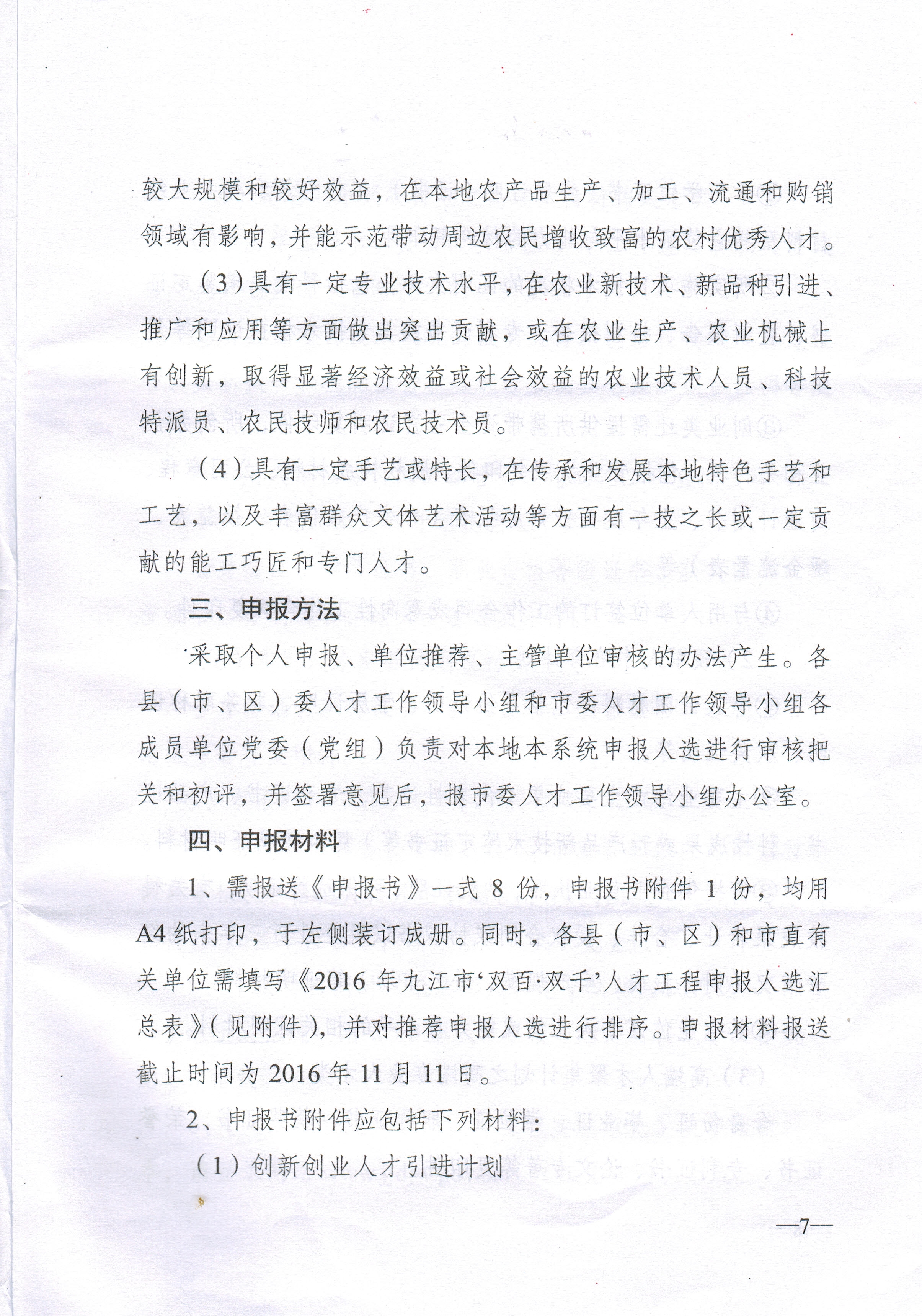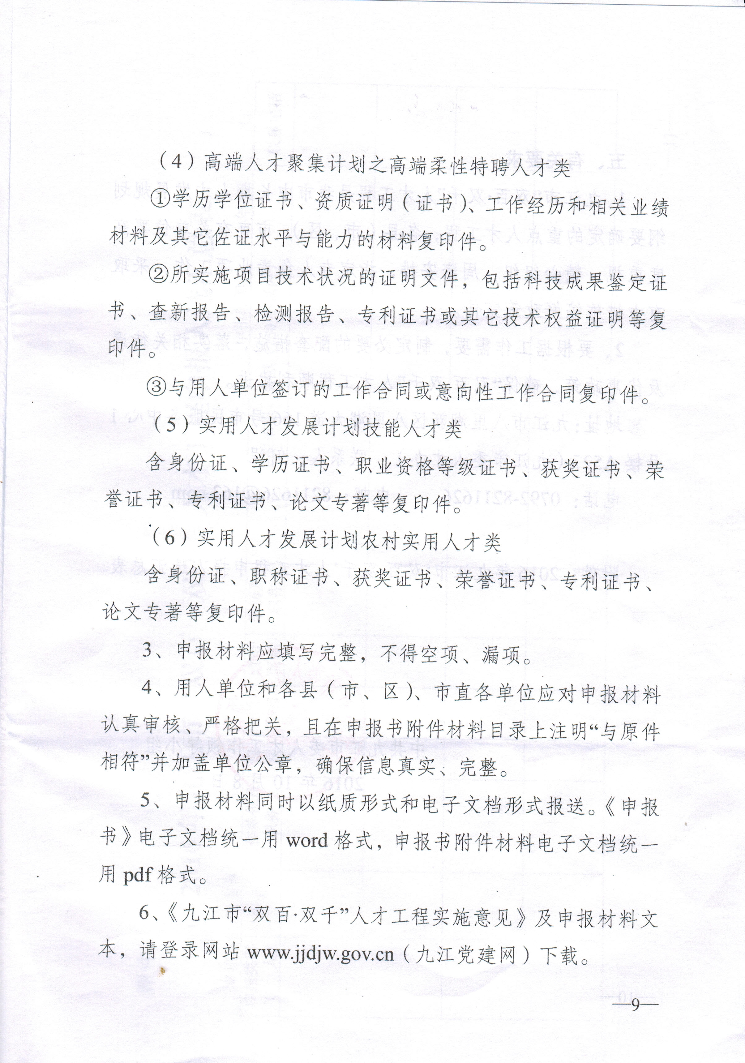 (说明:上述六类人才申报材料要求具体详见附件:中共九江市委人才工作领导小组《关于开展2016年九江市“双百?双千”人才工程申报推荐工作的通知》。)