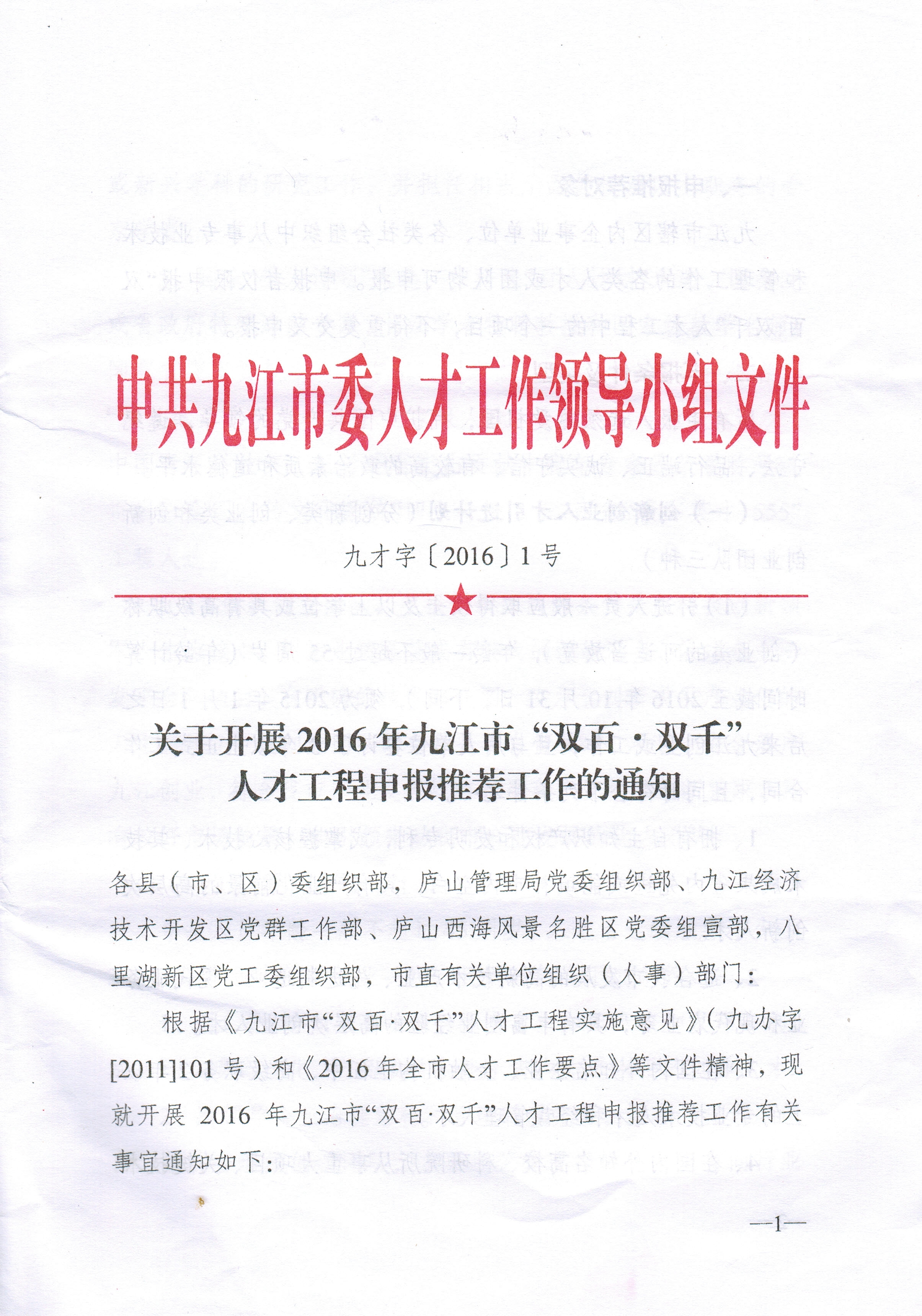 6、《九江市“双百·双千”人才工程实施意见》及申报材料文本,请登录网站www.jjdjw.gov.cn(九江党建网)下载。