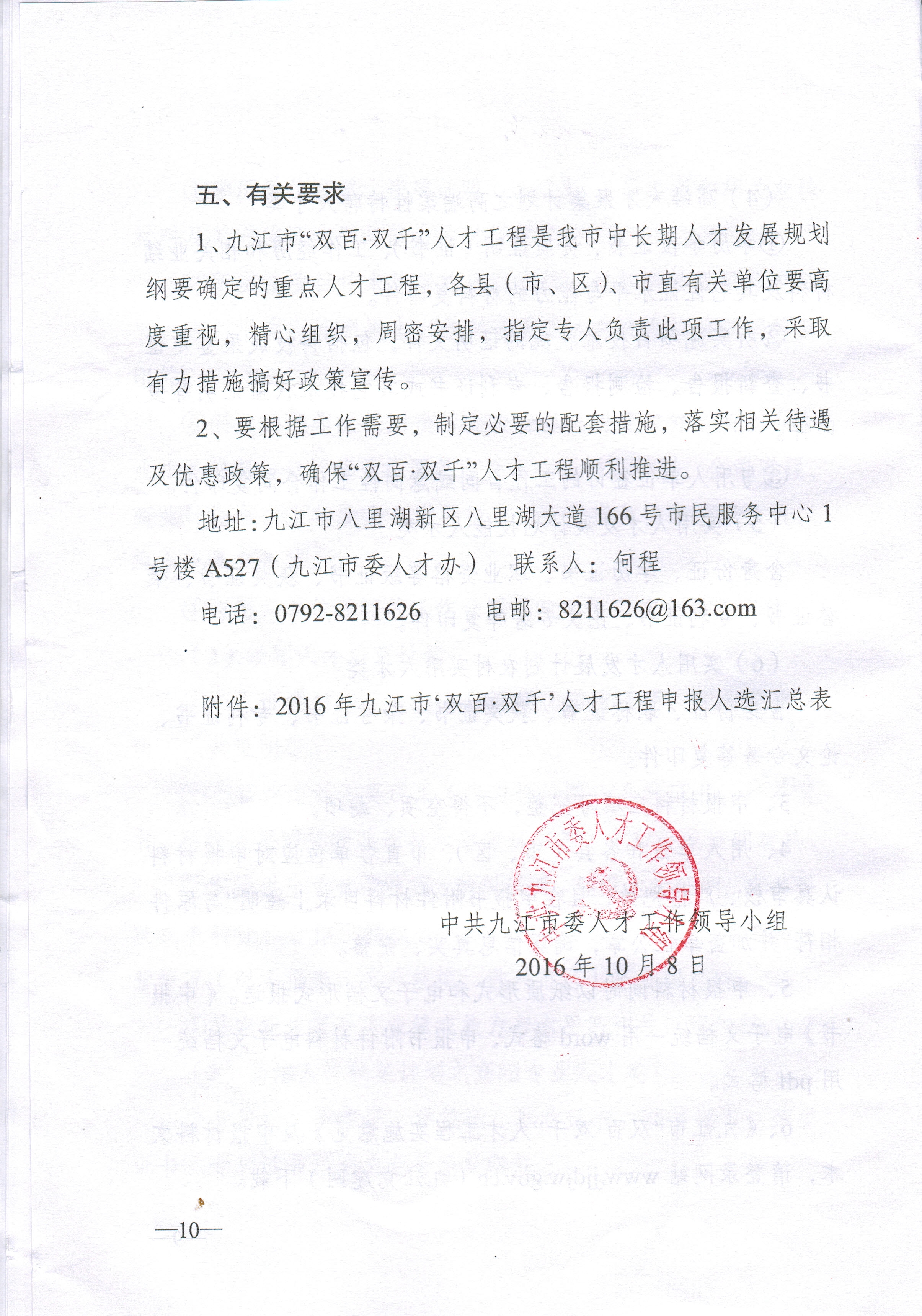 附件:九江市“双百双千”人才工程通知文件扫描件01.jpg九江市“双百双千”人才工程通知文件扫描件02.jpg九江市“双百双千”人才工程通知文件扫描件03.jpg九江市“双百双千”人才工程通知文件扫描件04.jpg九江市“双百双千”人才工程通知文件扫描件05.jpg九江市“双百双千”人才工程通知文件扫描件06.jpg九江市“双百双千”人才工程通知文件扫描件07.jpg九江市“双百双千”人才工程通知文件扫描件08.jpg九江市“双百双千”人才工程通知文件扫描件09.jpg九江市“双百双千”人才工程通知文件扫描件10.jpg中共九江市委人才工作领导小组《关于开展2016年九江市“双百?双千”人才工程申报推荐工作的通知》